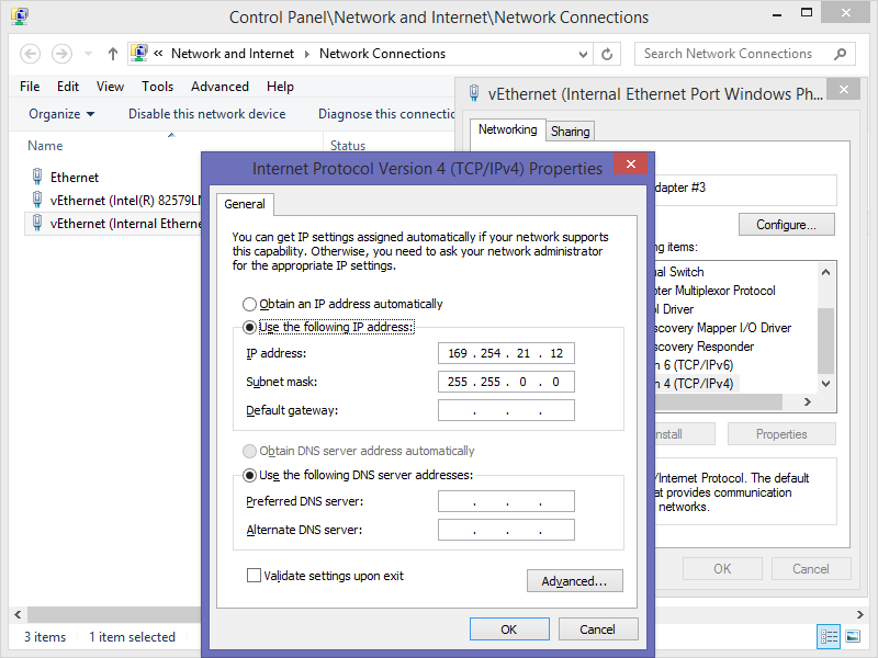 If you decide to use a custom IP address in the range that your Windows Phone 8 Emulator is using, you would need to enter that IP address in the IPv4 TCP/IP settings for the Internal Ethernet Port Windows Phone Emulator Internal Switch: