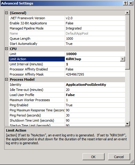 IIS 7 introduced support for CPU Throttling at an Application Pool level. You could specify a limit of CPU usage and a corresponding action to take when that limit was exceeded. The two available options were NoAction or KillW3wp. The names accurately reflect what each option does: Doing nothing in the case of NoAction, or killing the worker process for KillW3wp.