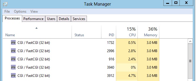 Let’s try another example, using PHP this time. As you know, PHP will use multiple processes for serving requests. We will see that the CPU utilization stays near 10% even when multiple processes are running. The sum of CPU usage for all of these processes will be limited to 10%. Here is a view of Task Manager showing the FastCGI processes running when I put load on the system. Note how the sum of all 5 processes is 10.4%.